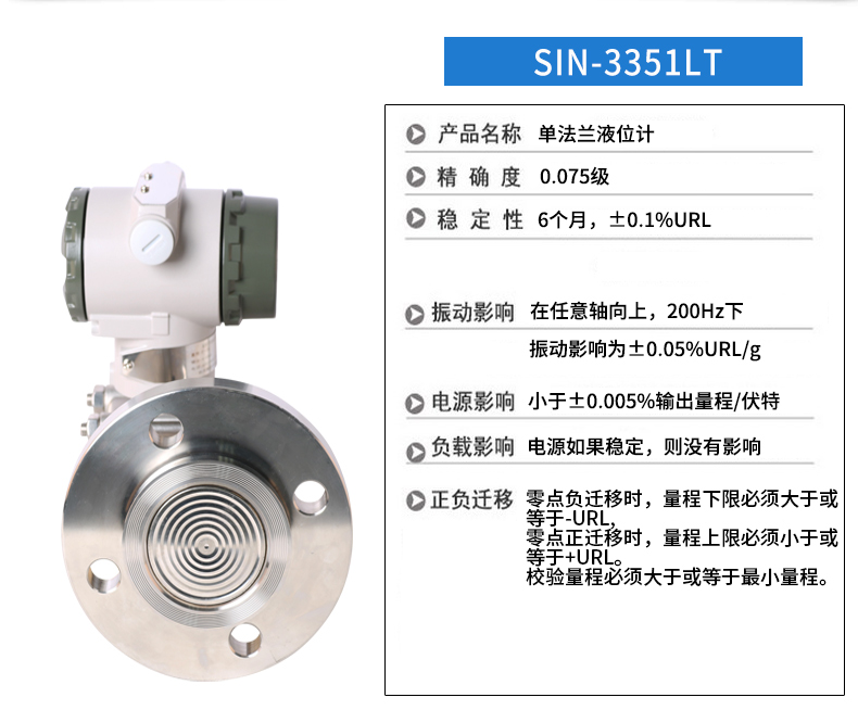 SIN-3051LT型單法蘭差壓液位變送器是我公司引進國外先進技術和設備生產的新型變送器,關鍵原材料,元器件和零部件均源自進口,整機經過嚴格組裝和測試,該產品具有設計原理先進、品種規格齊全、安裝使用簡便等特點。