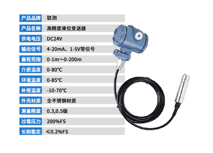 SIN-P261投入式液位變送器由高性能擴散硅壓阻式壓力傳感器作為測量元件,把與液位深度成正比的液體靜壓力準確測量出來,并經過信號調理電路轉換成標準(電流或電壓)信號輸出,建立起輸出信號與液體深度的線性對應關系,實現對液體深度的測量。產品精度高、體積小,直接投入液體中,即可測量出變送器末端到液面的液體高度,使用方便。適用于石油、化工、電廠、城市供水、水文勘探領域的液位測量與控制。經過長期老化及穩定性篩選,產品性能穩定可靠,能夠適用應用于環境比較惡劣的露天現場,同時能夠現場液位顯示,零點,滿程可遷移。